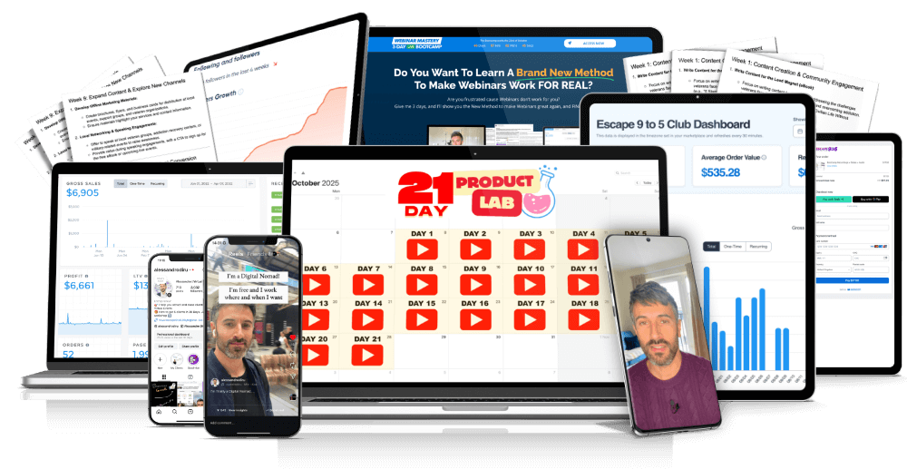 A 21-day, real-time video journal where you watch me take a product from zero to selling. You’ll see my actual process day-by-day: the idea validation, the product creation, the funnel building, and the sales generation…